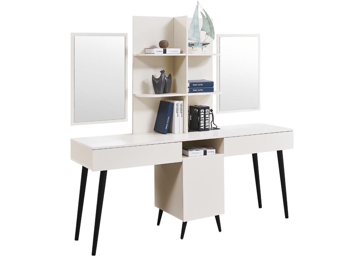 + طاولة خدمة جانبية برف ووحدة أدراج لخدمتك + خزانة ثياب بــ 6 أبواب ذات أرفف داخلية و أدراج لمساحة تخزين واسعة + طاولة تزيين أنيقة ذات أدراج و أرفف متعددة لخدمتك مع 2 مرآه لتكمل بها طلتك كما يمكن الاستفادة منها كمكتب للعمل أو الدراسة حسب حاجتك + 2 كرسي تسريحة راقي بمسند جلوس من قماش البوليستر البيج الفاتن لراحتك + وحدة أدراج متعددة لمساحة تخزين إضافية )