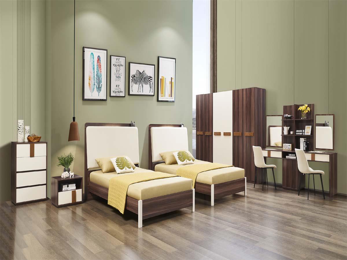 طقم غرفة نوم مفرده 10 قطع لون خشبي و بيج مطفي