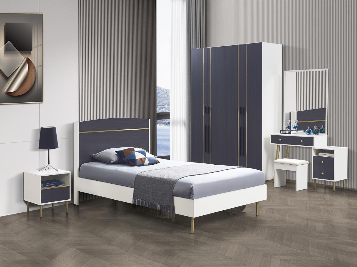 هذه المجموعة العصرية مصممة بشكل مميز لتناسب كافة ديكورات منزلك الداخلية , كما أنها مصنوعة من مواد عالية الجودة و الخشب المتين بسماكة 5,15,25 ملم لضمان القوة و الاستدامة , كمان أن السرير و الطاولة الجانبية و طاولة التزيين تأتي بقوائم خشبية لتضمن لك سهولة النقل و التحريك , هذه المجموعة مناسبة لغرف الأطفال أو غرف الضيوف أو للفنادق و الشقق المفروشة ,تتميز بلون أزرق داكن فاتن و أبيض خشبي أنيق , كما أنها تأتي بتفاصيل ذهبية تزيد من جمالها وروعتها لتستمتع بتجربة نوم فريدة لا مثيل لها تدوم طويلاَ .