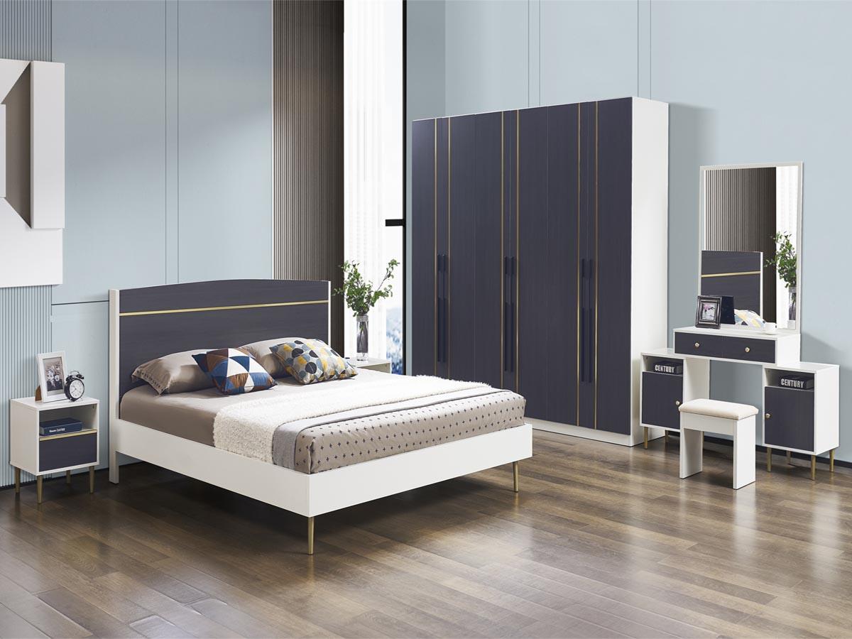( سرير مزدوج راقي بظهر من الخشب أزرق داكن جذاب + 2 طاولة جانبية بوحدة أدراج مزودة بمدخل USB لخدمتك + خزانة ثياب واسعة بــ 6 أبواب و بأرفف داخلية متعددة لمساحة تخزين عالية + طاولة تزيين راقية ذات أدراج متعددة لحفظ كافة مستلزماتك الشخصية + مرآة لتكمل بها طلتك + كرسي تسريحة قماشي أبيض أنيق لراحتك أثناء جلوسك )