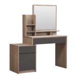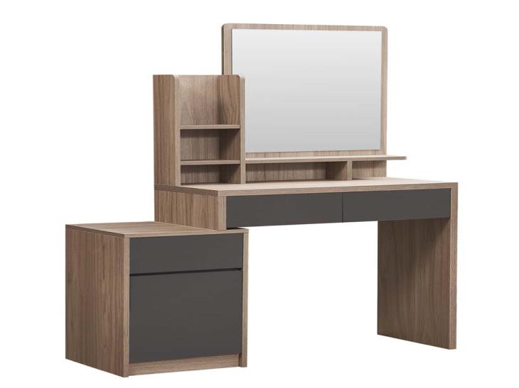 + طاولة تزيين أنيقة ذات أدراج و أرفف متعددة لخدمتك مع مرآه لتكمل بها طلتك + كرسي تسريحة راقي بمسند جلوس لراحتك )