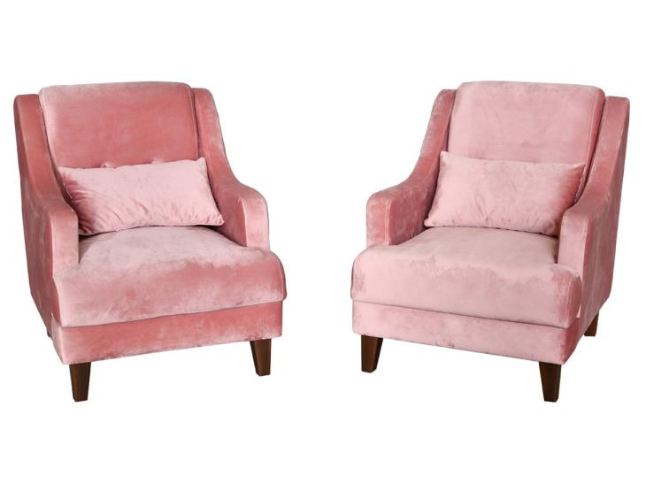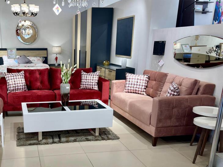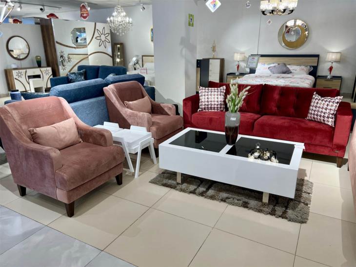 كنبة ثلاثية واسعة باللون الأحمر الجذاب + كنبة ثلاثية باللون الزهري الأنيق + 2 كرسي مفرد باللون الزهري المميز