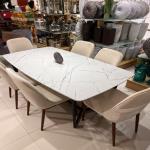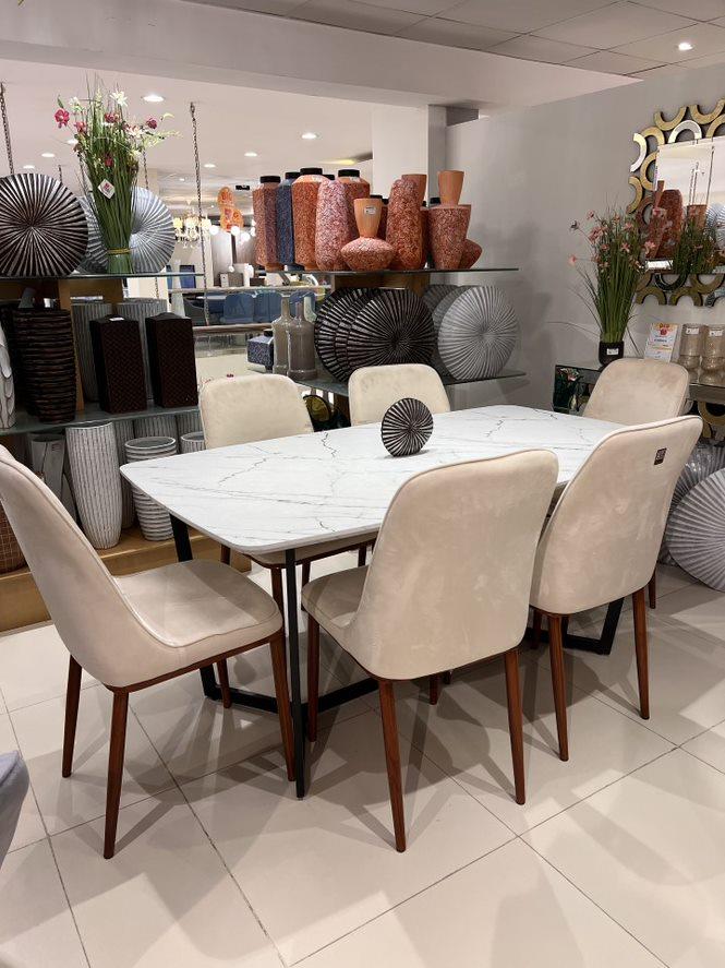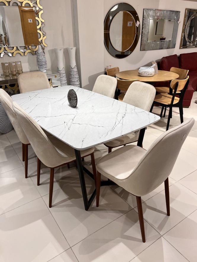 على طاولة الطعام الرخامية المميزة هذه , المكونة من 6 كراسي جذابة