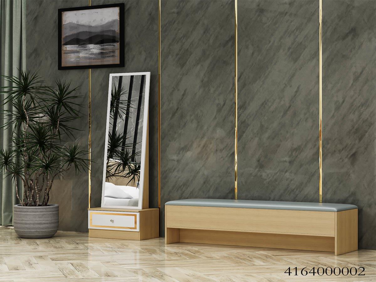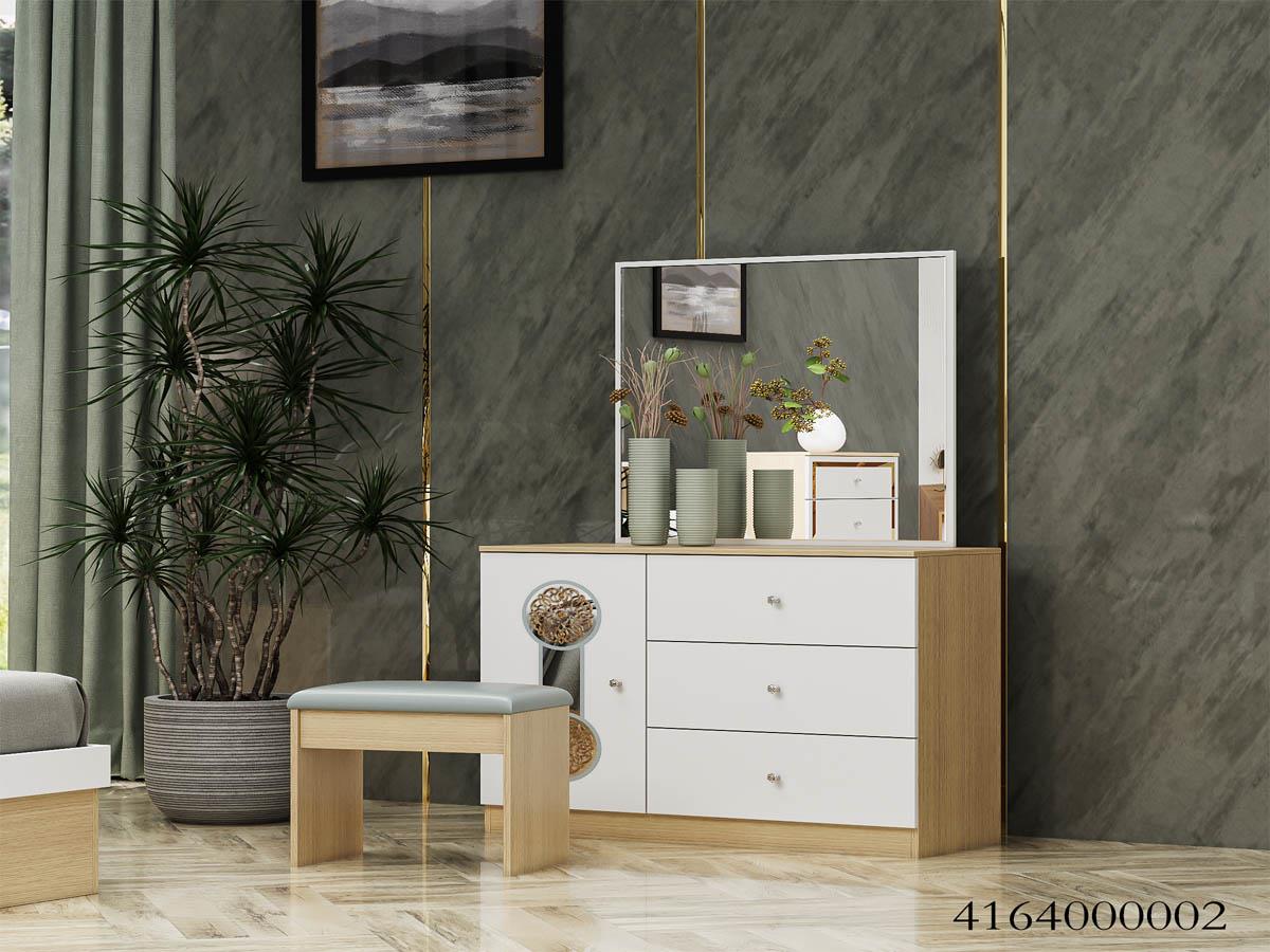 طاولة تزيين أنيقة مع مرأة طولية مميزة وكرسي جلوس فاخر ومريح ، ووحدة ادراج منظمة