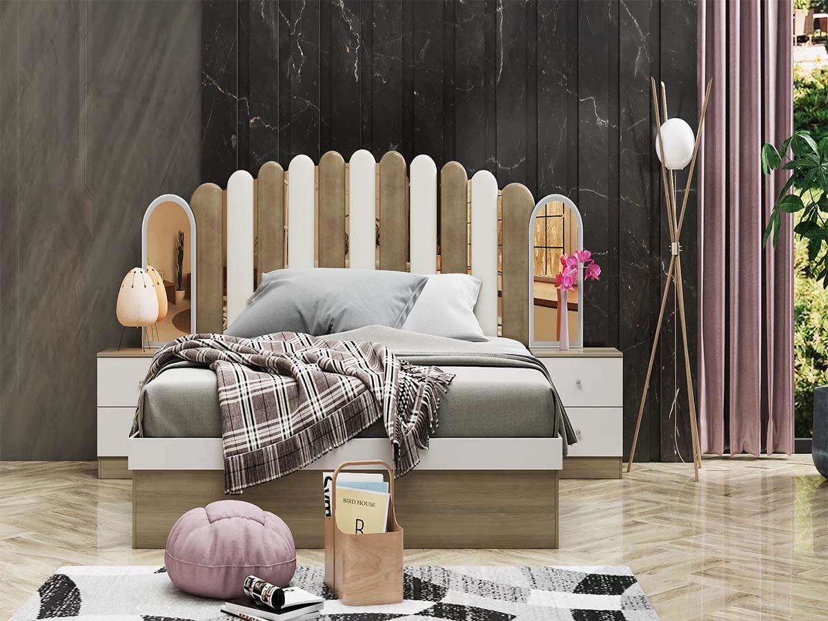 مكونة من ( سرير كنج مدمج باللونين الأبيض والبني + طاولتان جانبية راقية بوحدات تخزين متحركة