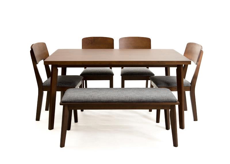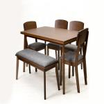 Oliver dining table 4 chairs with bench in brown and gray color Distinguish your home by purchasing this unique wooden dining table, consisting of 4 wooden chairs with fabric seats in a charming gray color, and an attractive and elegant bench that increases its beauty and magnificence, with an attractive and attractive brown wooden design, and features a beautiful wooden surface and sturdy legs that guarantee strength and endurance Designed in a luxurious modern style, it is made of high-quality materials to ensure sustainability It is also easy to clean and maintain, for a modern and long-term use experience.