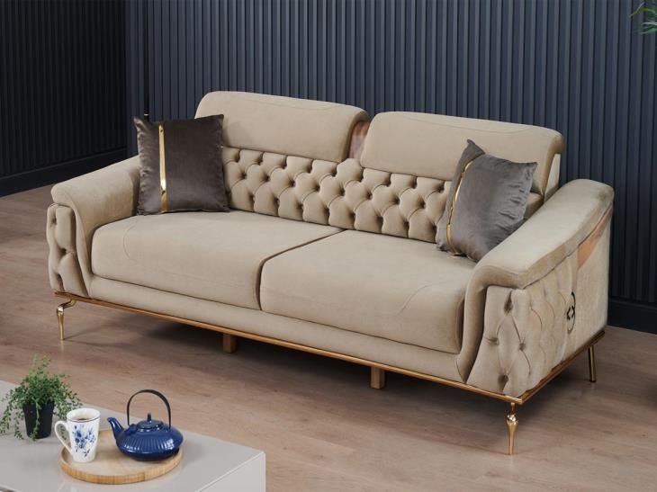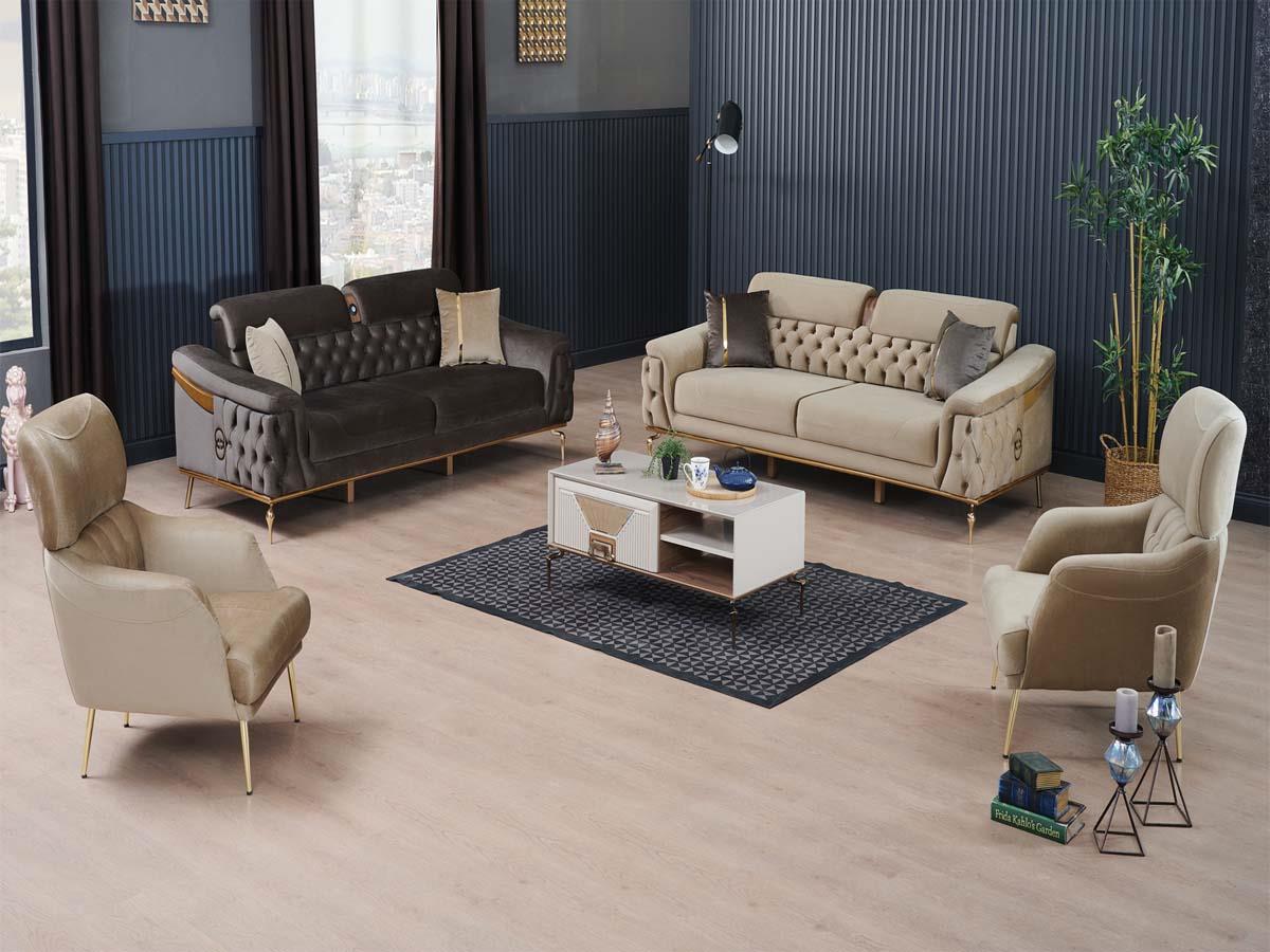 2 كنبة ثلاثية واسعة جذابة بلون بيج وبنى فاتح + 2 كرسي مفرد بلون بنى فاتح