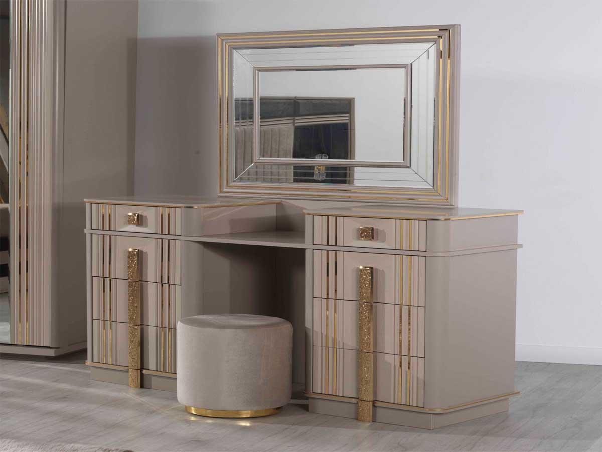 و الترتيب تأتي مع مرايا لتكمل بها طلتك + طاولة تزيين أنيقة مزودة بوحدات أدراج لخدمتك و كرسي بف أنيق لراحتك + وحدة أدراج متعددة لتوفر لك مزيدا من التخزين و التنظيم