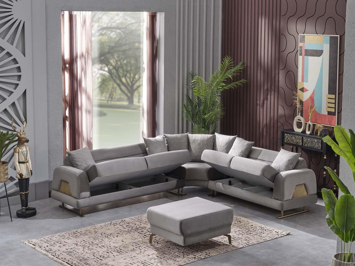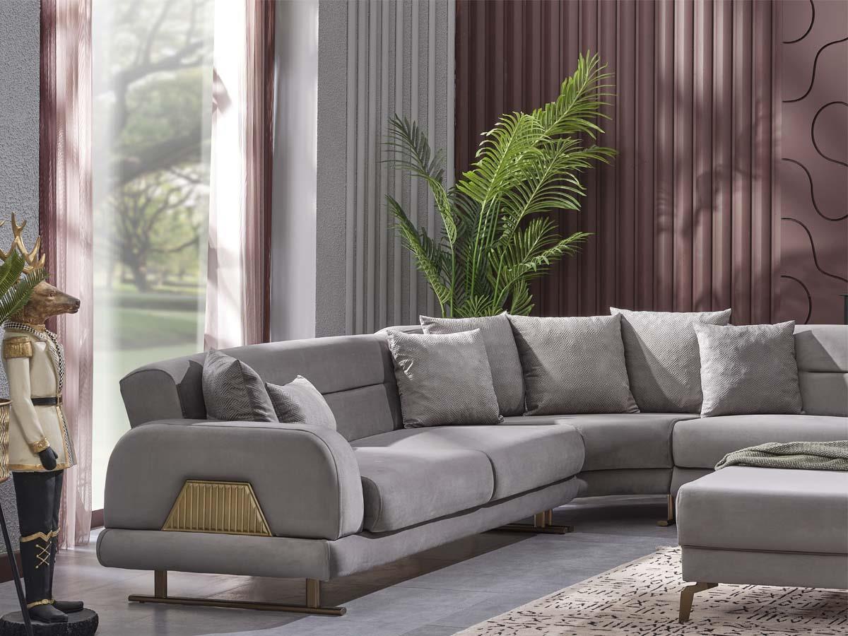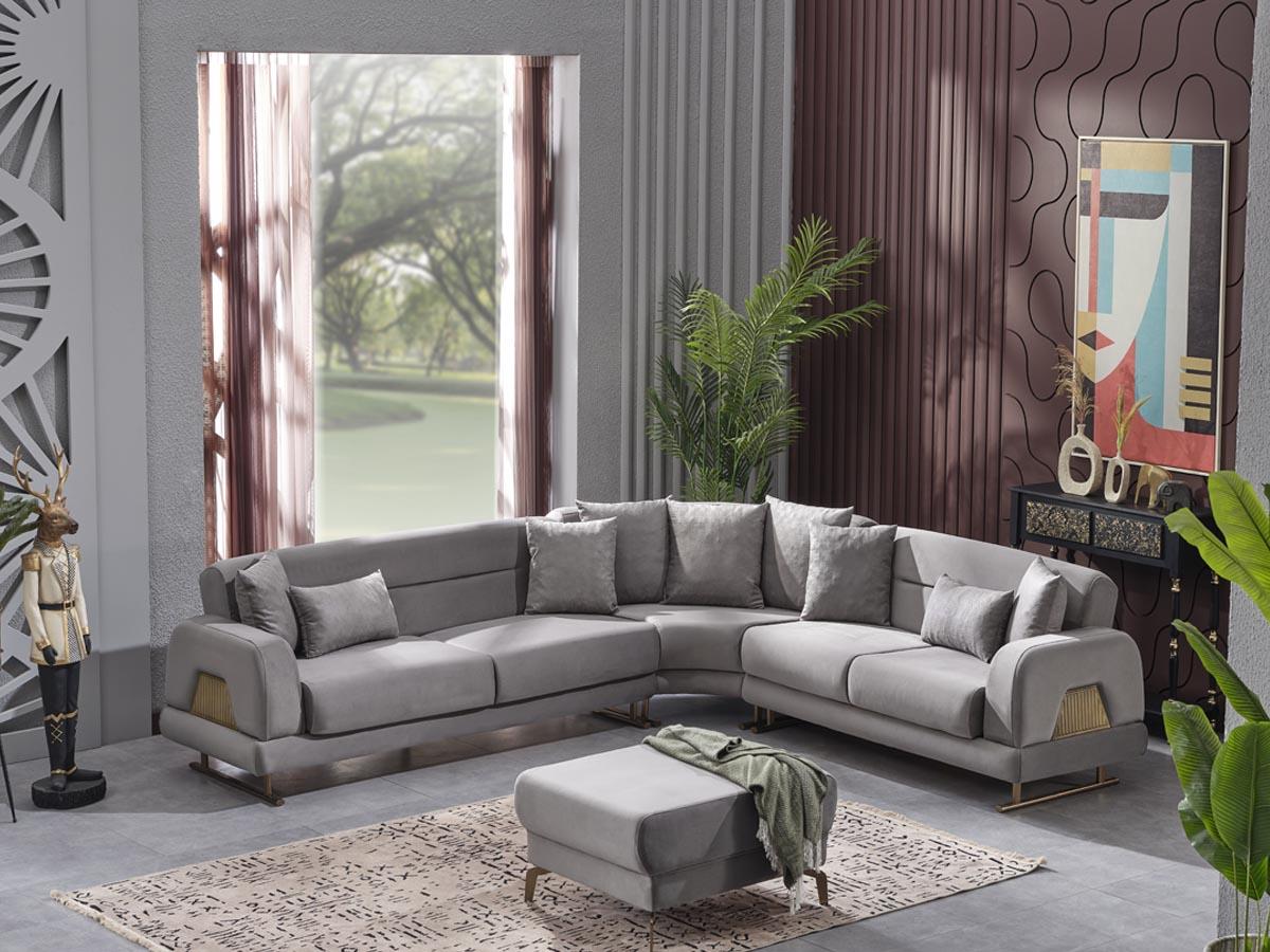 جدد مظهر منزلك بإضافات عصرية مميزة، وباختيارك هذا الطقم الأنيق الذي يناسب مساحاتك الداخلية المختلفة كنب زاوية قابل للربط مكون من 4 قطع.. (كنبة ثلاثية يسار بذراع ثابت ومساحة واسعة + كنبة زاوية أنيقة + كنبة مزدوجة يمين بذراع ثابت وعمق واسع + كنبة مفردة على شكل بوف لراحتك) هذا الطقم مصنوع من لوح خشبي مضغوط متين وحشوة إسفنجية من الإسفنج الناعم عالي الجودة بسمك يصل إلى 28 لضمان المتانة والتحمل، ومنسوج بأجود أنواع القطن الصناعي فائق النعومة لراحتك أثناء الجلوس، يتميز بتصميم عصري أنيق ولون رمادي لافت، يأتي بأرجل معدنية وتفاصيل باللون الذهبي المتطور لزيادة جماله وروعته، ولضمان سهولة النقل والحركة، قطعة عملية وأنيقة تناسب ذوقك ومساحتك، لتستمتع بتجربة استخدام لا مثيل لها.