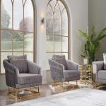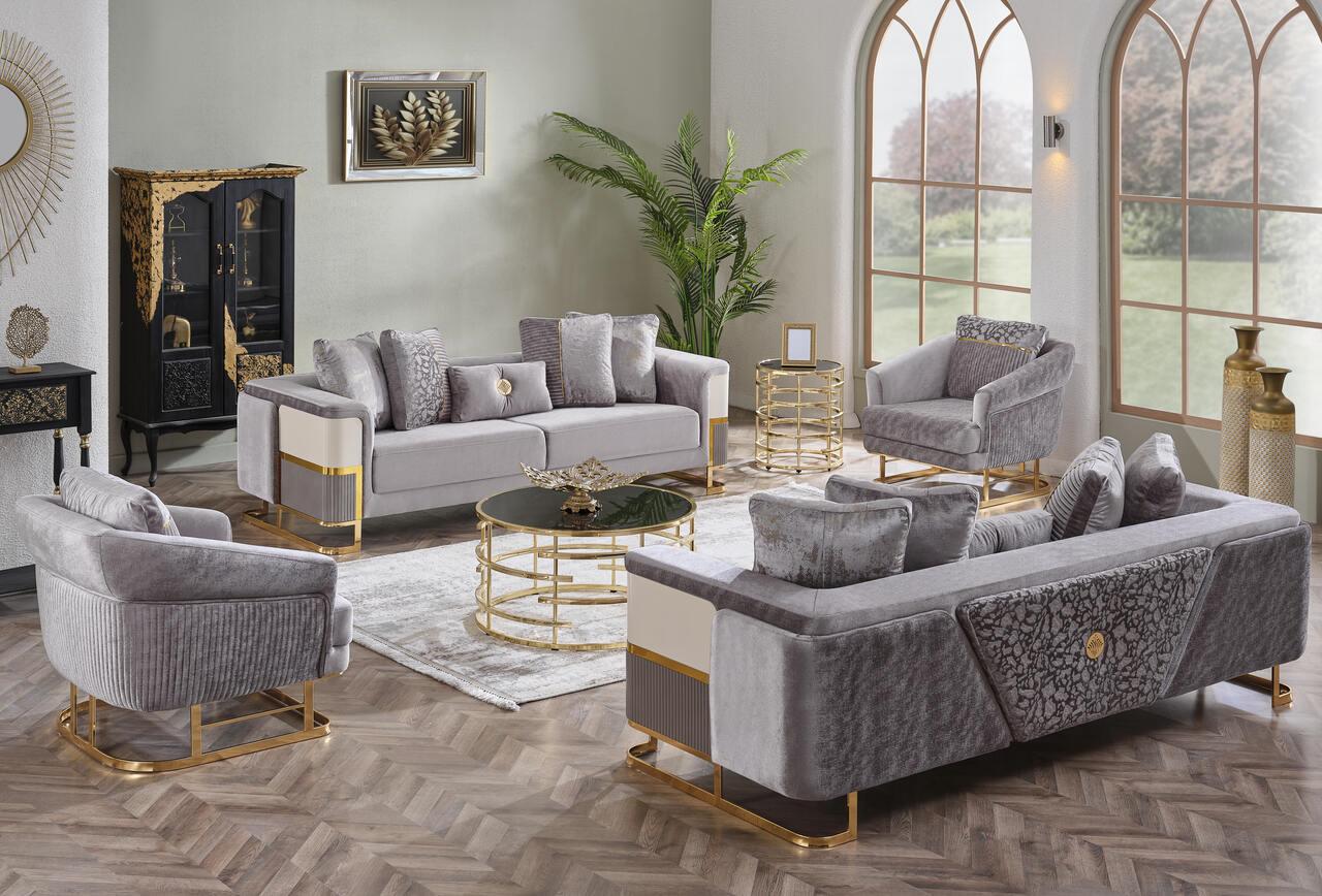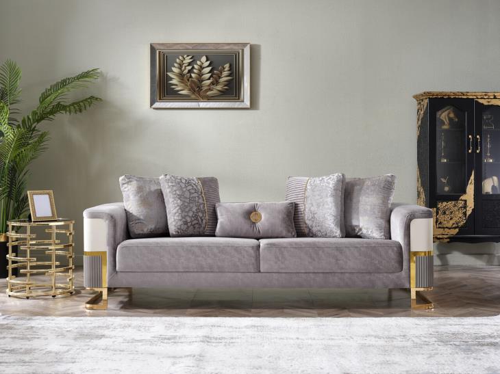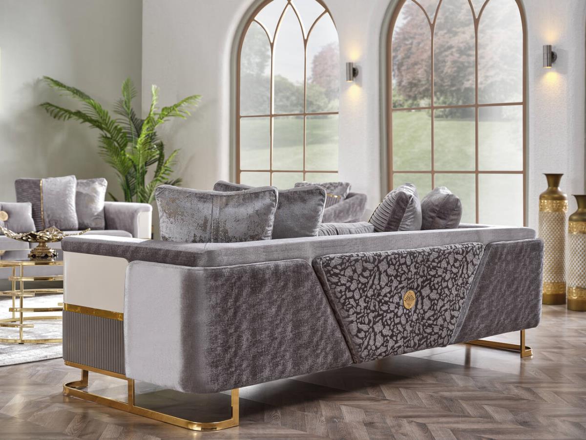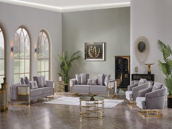 هذه المجموعة مصنوعة من لوح الخشب الصناعي المضغوط و المتين و الحشو الرغوي من الإسفنج الناعم عالي الجودة بسماكة تصل الى 28 DNCلضمان المتانة و التحمل , ومنسوجة بأجود أنواع القطن الصناعي فائق النعومة لراحتك أثناء جلوسك , تتميز بتصميم عصري أنيق و باللون الرمادي الملفت , تأتي بأرجل معدنية و تفاصيل باللون الذهبي الراقي ليزيد من جمالها و روعتها , و لتضمن لك سهولة النقل و التحريك , قطعة عملية راقية تناسب ذوقك و مساحتك , لتنعم بتجربة استخدام لا مثيل لها .
