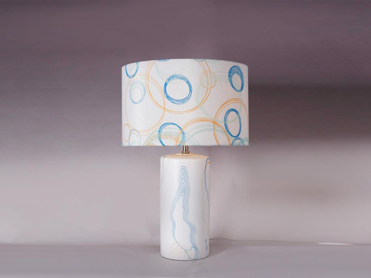 Table lamp, white and blue Renew the details of your home decorations, by purchasing this wonderful lampshade, which has a distinctive design of stunning white ceramic with elegant blue inlays, with a modern design and innovative engineering details that increase its beauty and splendor,Designed to provide sufficient lighting for your distinctive spaces, and designed with a circular fabric cover with attractive colored patterns to add an elegant look to it, to suit your home in a modern and distinctive way.