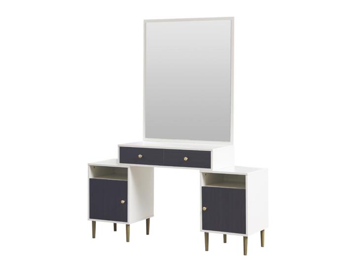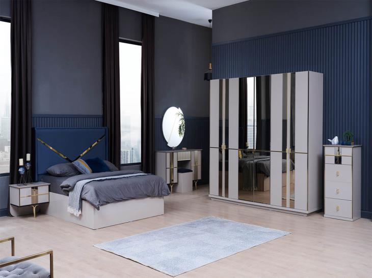( سرير مزدوج راقي بظهر من الخشب أزرق داكن جذاب + 2 طاولة جانبية بوحدة أدراج مزودة بمدخل USB لخدمتك + خزانة ثياب واسعة بــ 6 أبواب و بأرفف داخلية متعددة لمساحة تخزين عالية + طاولة تزيين راقية ذات أدراج متعددة لحفظ كافة مستلزماتك الشخصية + مرآة لتكمل بها طلتك + كرسي تسريحة قماشي أبيض أنيق لراحتك أثناء جلوسك )