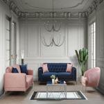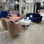 كنبة ثلاثية مخملية أنيقة باللون الأزرق الأنيق + كنبة ثلاثية مخملية باللون الزهري الفاتن + 2 كرسي مفرد أنيق باللون الزهري المميز