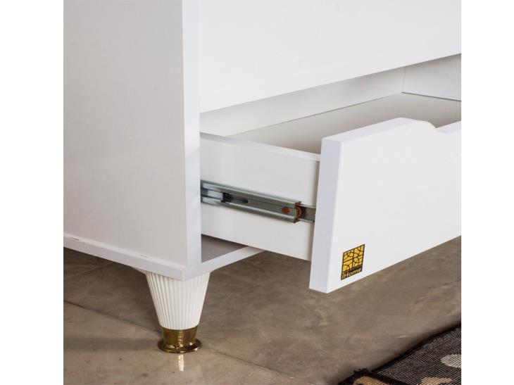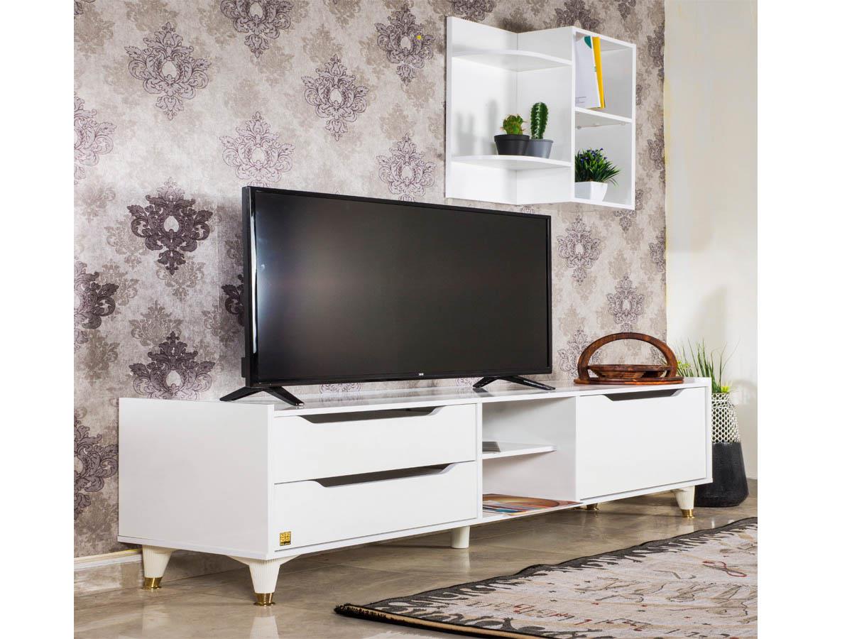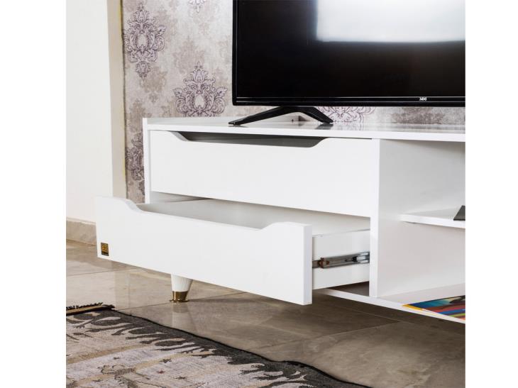 Cordoba TV unit, 180 cm, white color Add an elegant imprint to the luxurious furniture pieces in your home by obtaining this wonderful TV cabinet.Made of heat treated engineered wood with a finish that enhances its quality and beauty.It has an ideal space for storage and organization through its drawer units and multiple shelves, with an elegant white color and innovative details that add to its beauty and splendor, and it is easy to clean, which makes it worth owning.