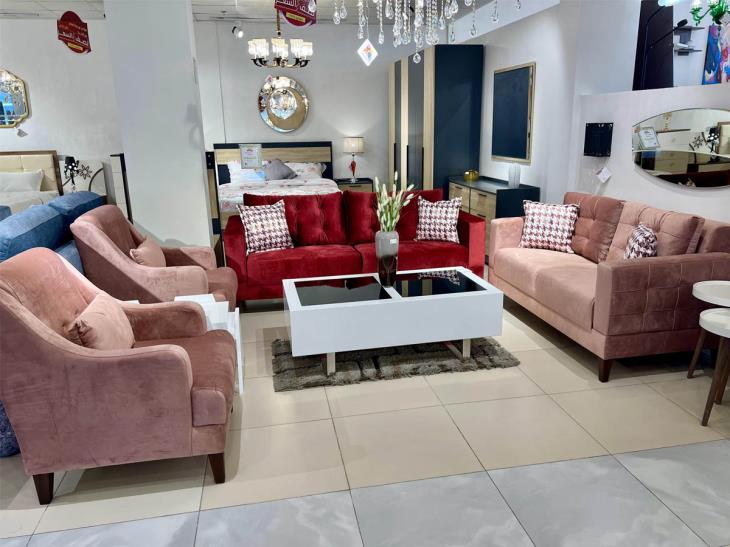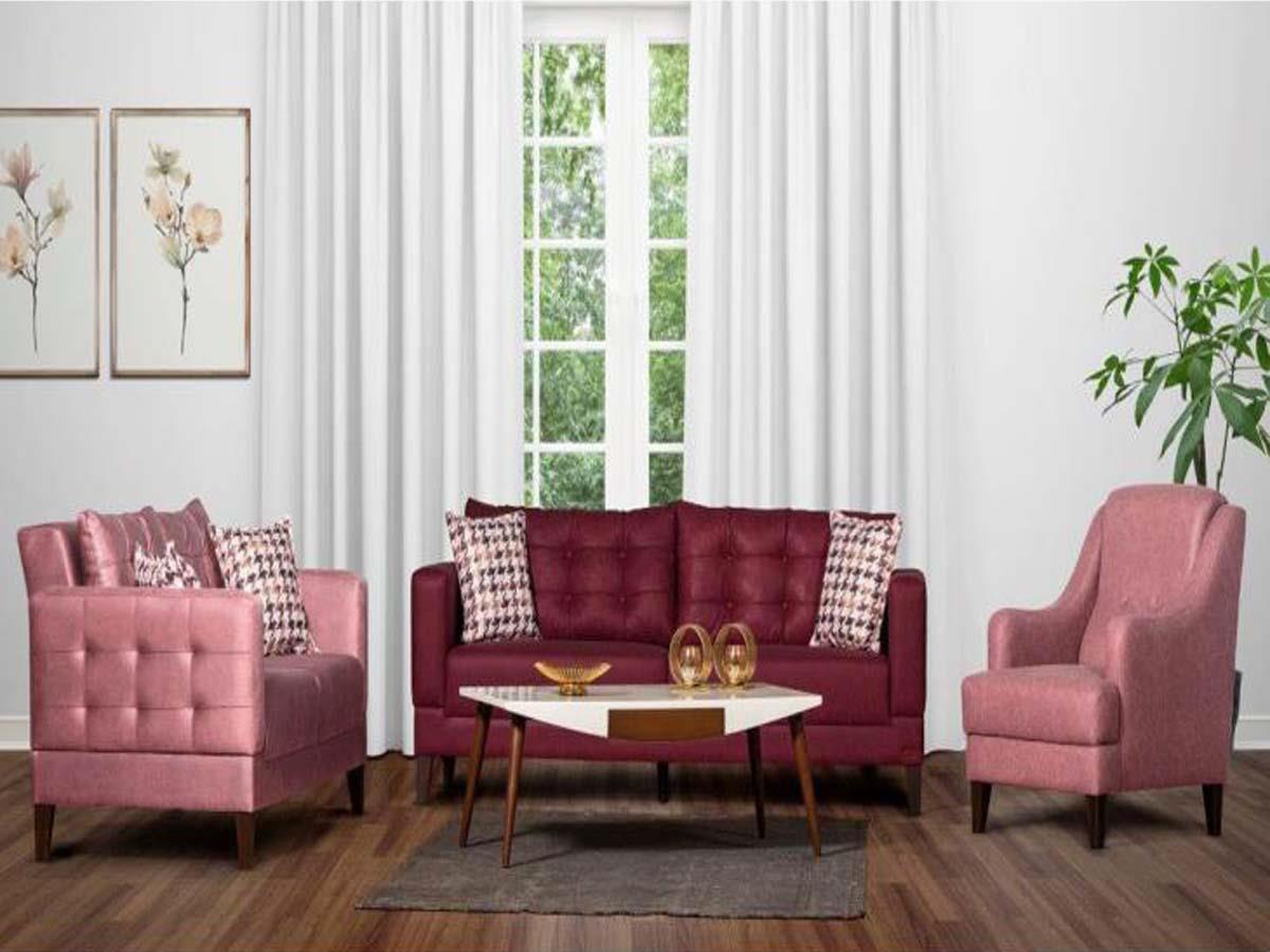 كنبة ثلاثية واسعة باللون الأحمر الجذاب + كنبة ثلاثية باللون الزهري الأنيق + 2 كرسي مفرد باللون الزهري المميز