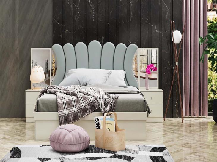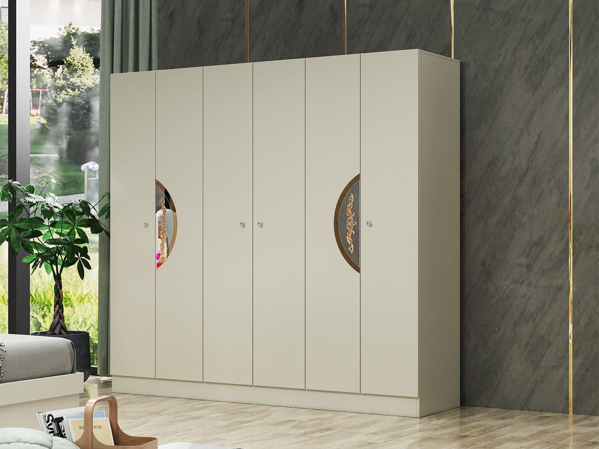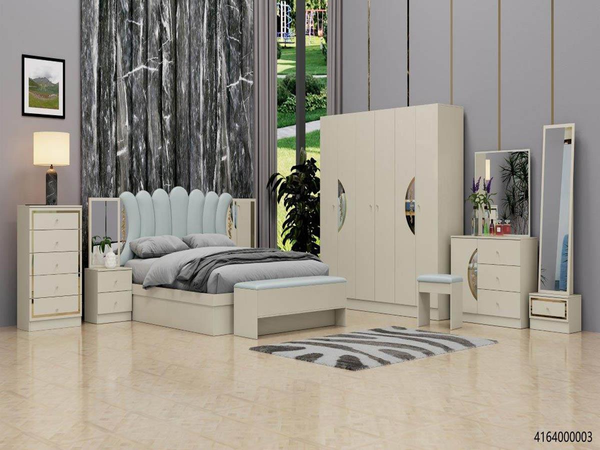 ( سرير مزدوج بظهر من الجلد الفاخر + 2 طاولة خدمة جانبية مع أدراج لخدمتك + خزانة ثياب واسعة مصممة ب 6 أبواب لمساحة تخزين عالية بتفاصيل مرايا أنيقة تزيد من جمالها + طاولة تزيين أنيقة بوحدات أدراج متعددة لحفظ مقتنياتك الشخصية مع مرآه لتكمل بها طلتك + كرسي تسريحة جذاب + وحدة أدراج متعددة لتوفر لك مساحة تنظيم إضافية + كرسي بنش أنيق لتستمتع بتجربة جلوس مريحة و مميزة + ستاند مرايا أنيق لتكمل بها مظهرك )