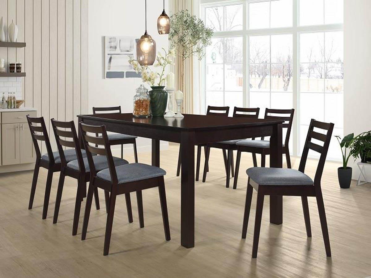 باقتناء طاولة الطعام الأنيقة هذه المكونة من 8 كراسي فاخرة , مصممة بمظهر قماشي بلون رمادي أنيق وجذاب ، بتصميم عصري فاتن وسطح خشبي بني مميز