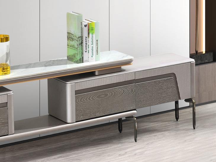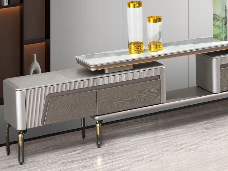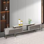 استاند تلفزيون عملي أنيق , بتصميم عصري مميز بسطح رخامي و أرجل من الاستيل لضمان المتانة