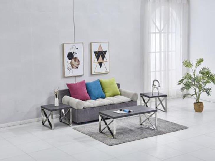 و لون رمادي فاتح ملفت وتفاصيل من الرمادي الغامق الجذاب , مع طاولتان جانبية بسطح زجاجي بقوائم معدنية