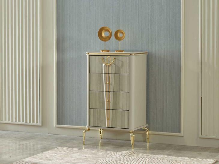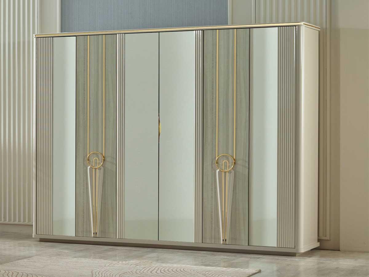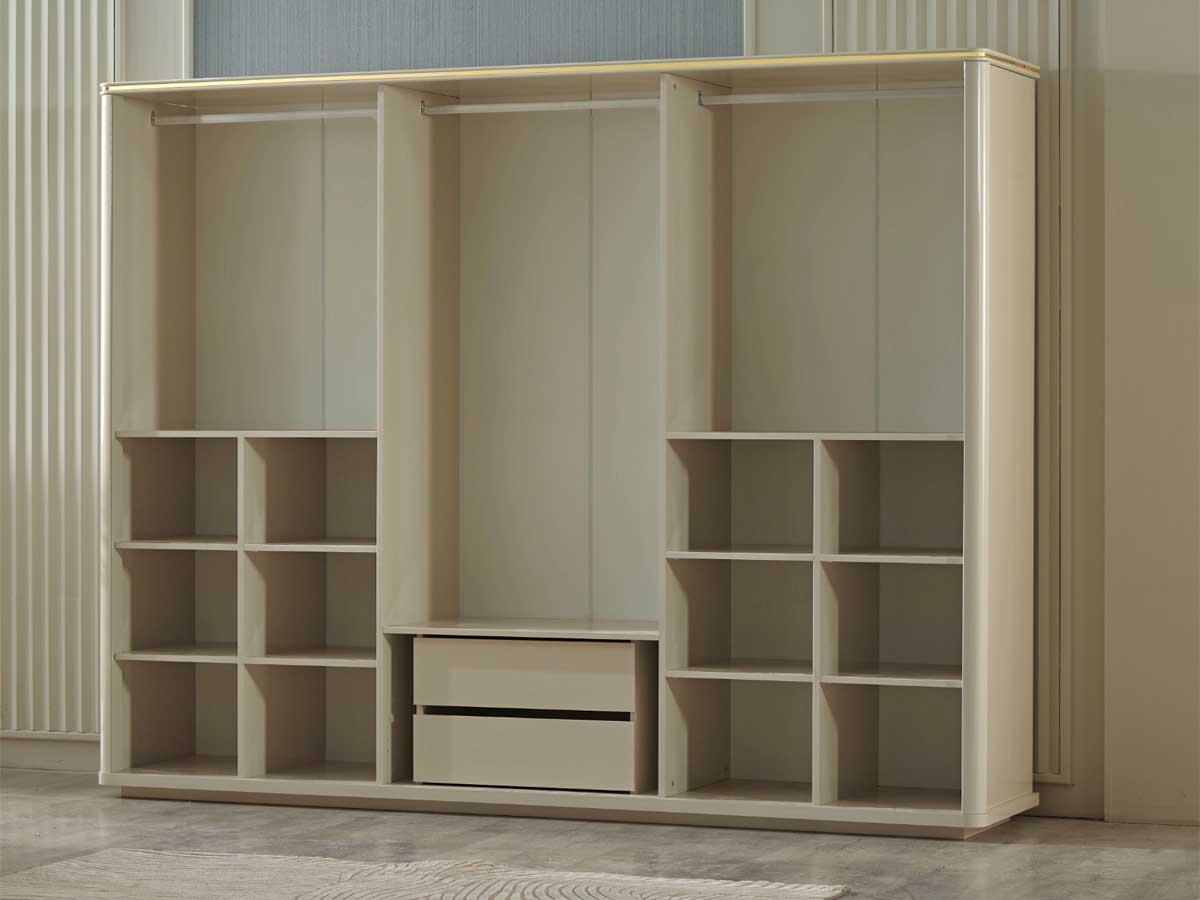 مجموعة راقية مصممة من ألواح خشب الاوكاليبتوس المتين بسماكة 18 مل لضمان القوة و التحمل , باللون البيج الساحر و تتميز بتفاصيل و مقابض باللون الذهبي الفاتن تزيد من جمالها وروعتها