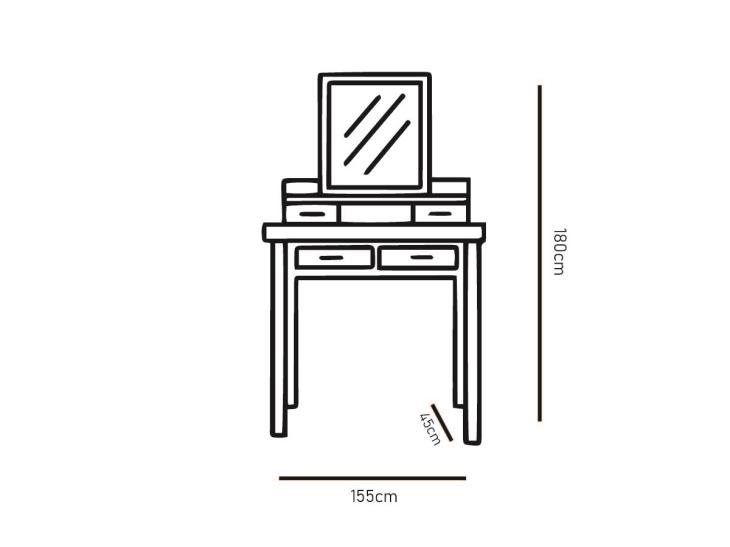 و الترتيب تأتي مع مرايا لتكمل بها طلتك + طاولة تزيين أنيقة مزودة بوحدات أدراج لخدمتك و كرسي بف أنيق لراحتك + وحدة أدراج متعددة لتوفر لك مزيدا من التخزين و التنظيم