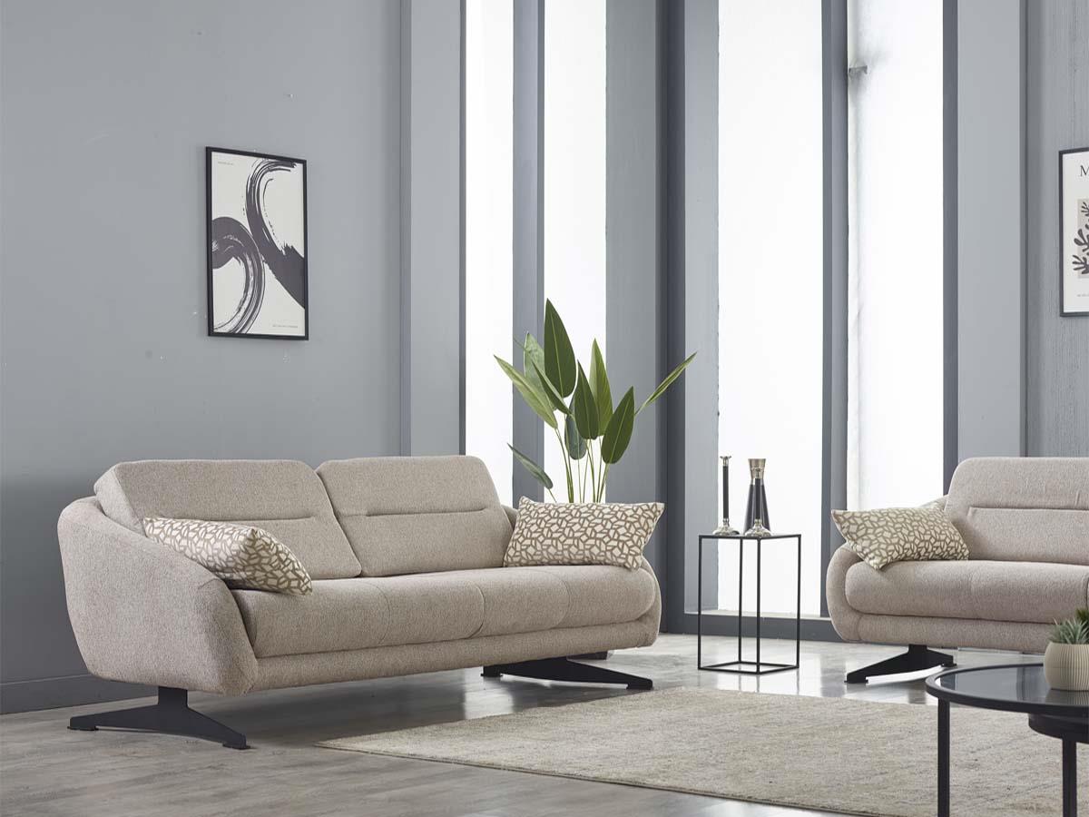 A spacious and comfortable triple sofa in an attractive light brown color + a wide triple sofa in a charming light brown color + 2 single chairs in an elegant beige color,