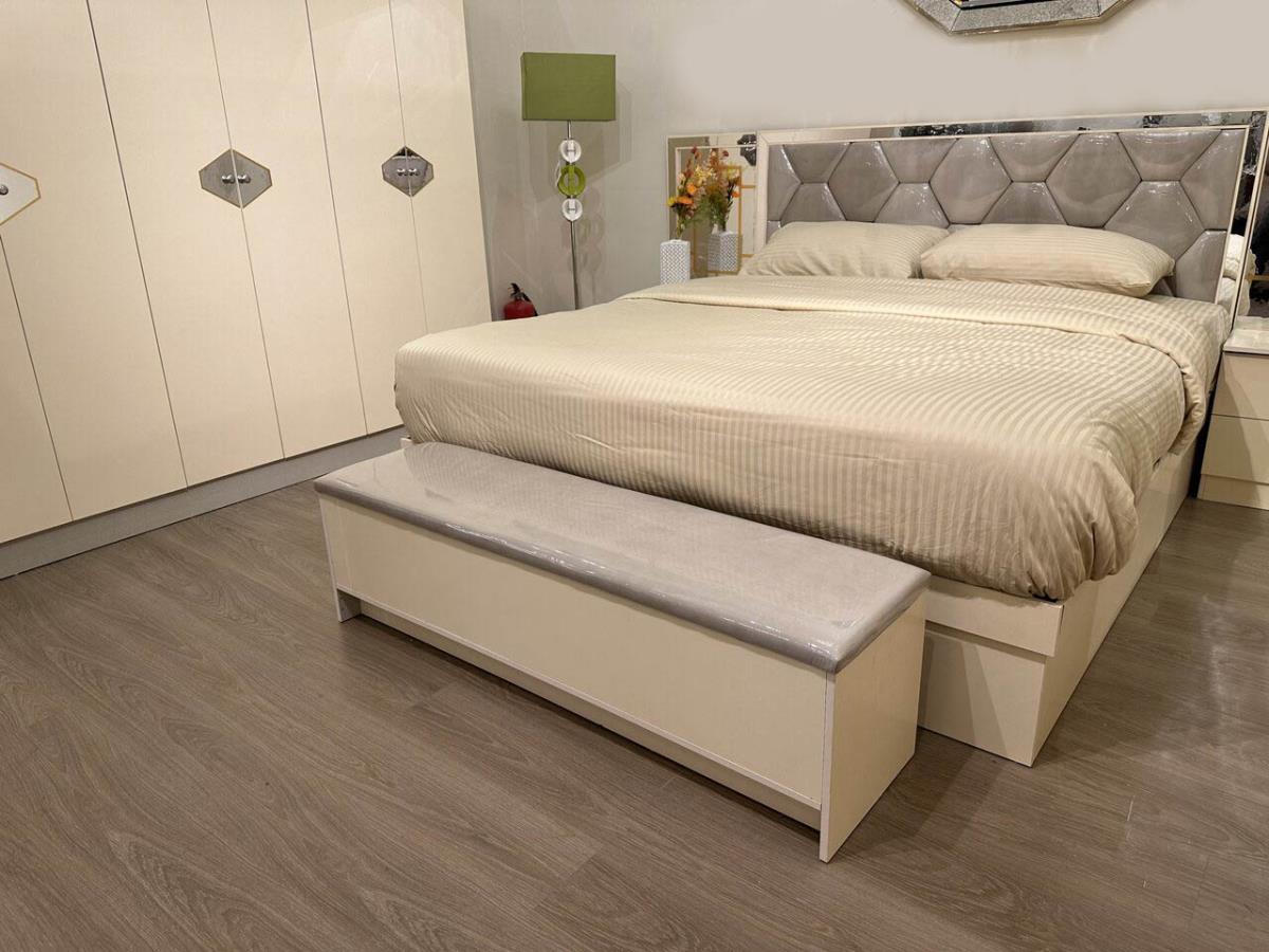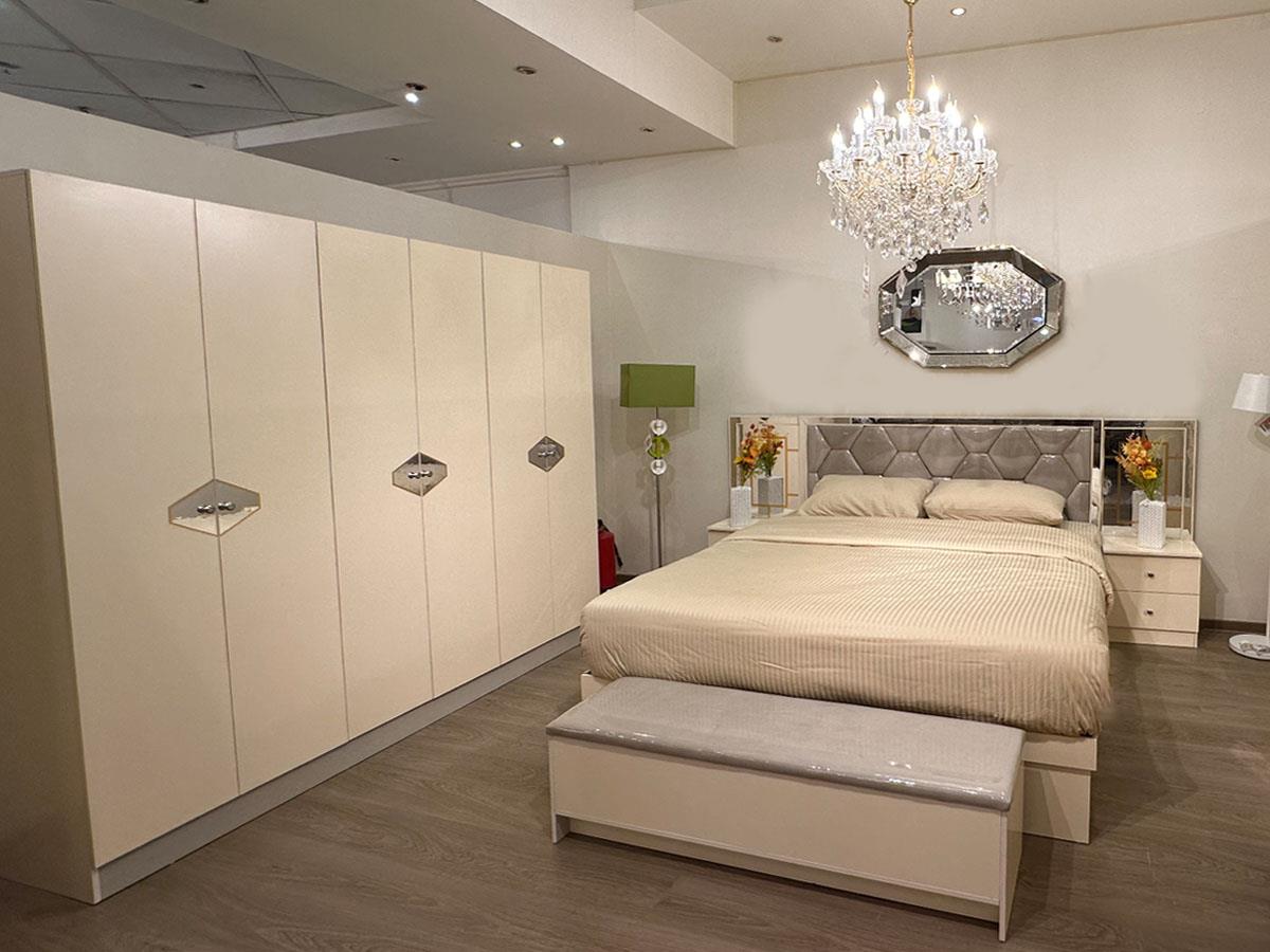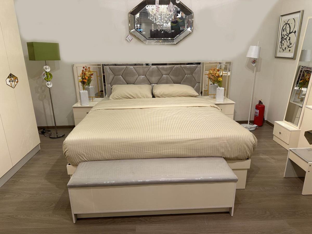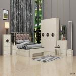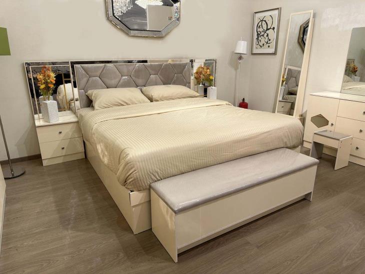 (Double bed with elegant fabric back + 2 side tables with drawers to serve you + Spacious wardrobe designed with 6 doors for high storage space with mirror details that enhance its beauty + Elegant dressing table with multiple drawer units to store your personal items with a mirror to complete your look + Attractive dressing chair with charming backrest + Multiple drawer unit to provide you with additional organizing space + Elegant bench chair with charming backrest to enjoy a comfortable and distinctive sitting experience + Elegant mirror holder to complete your look)