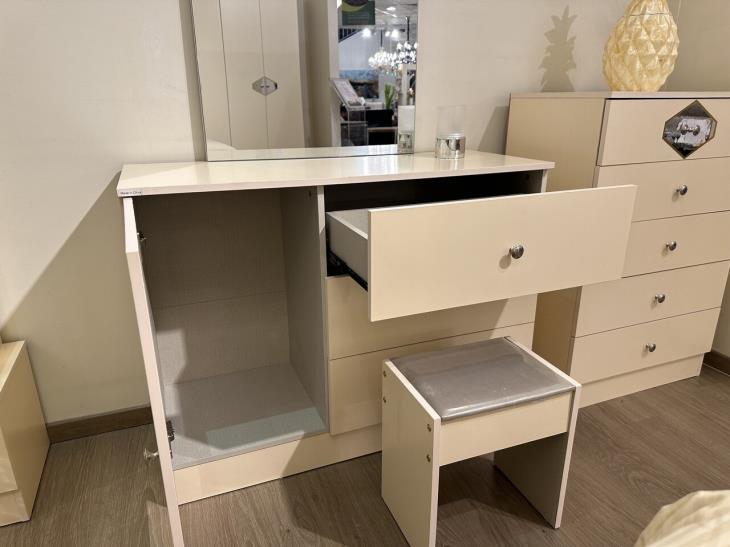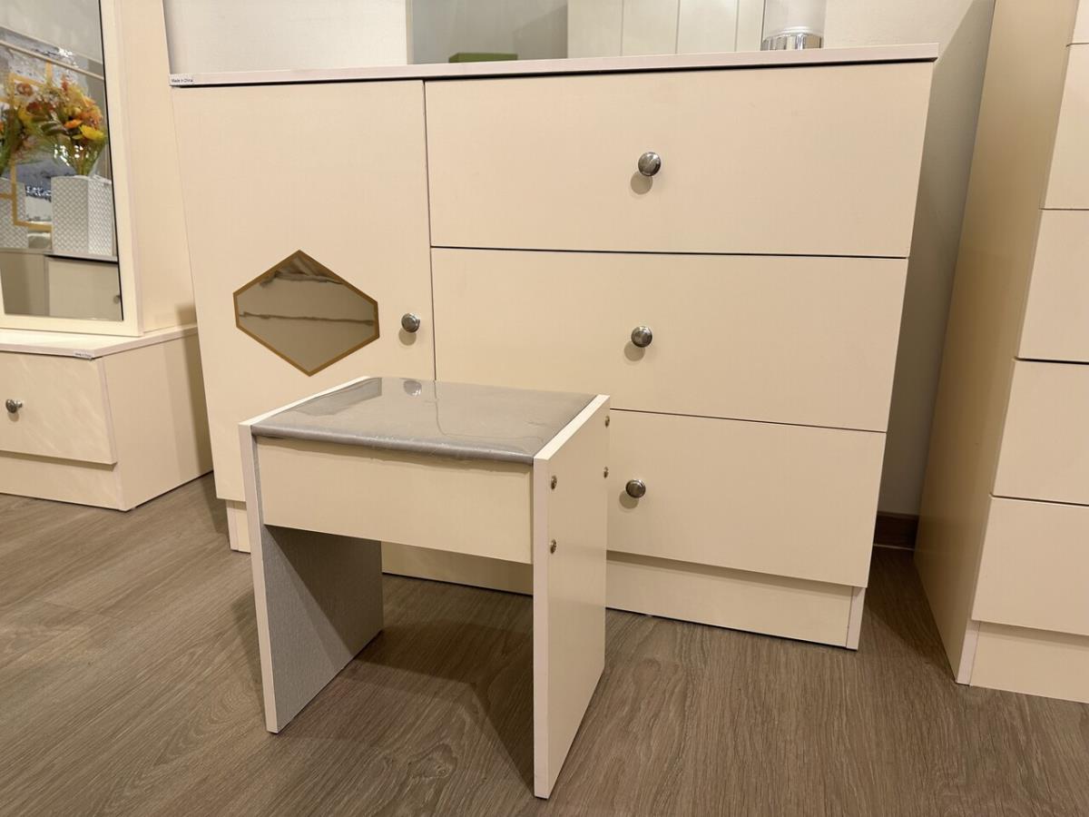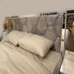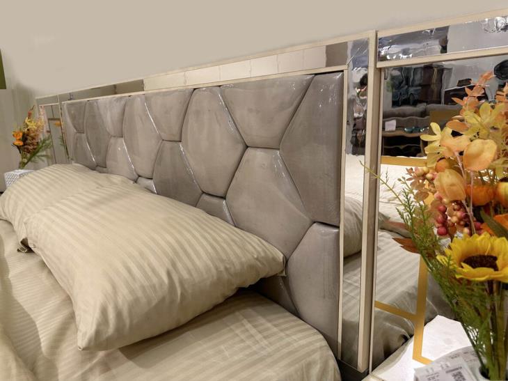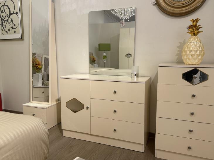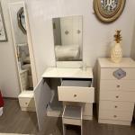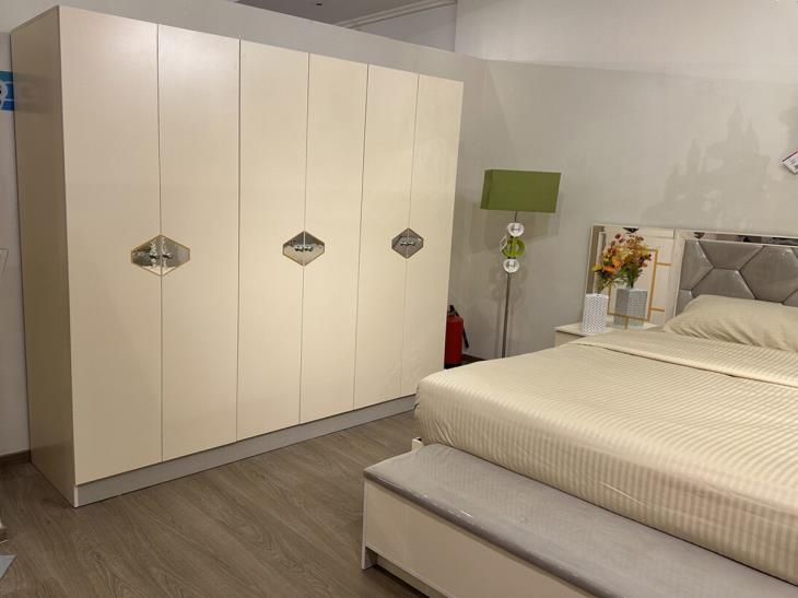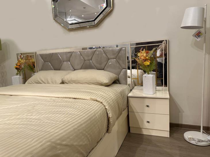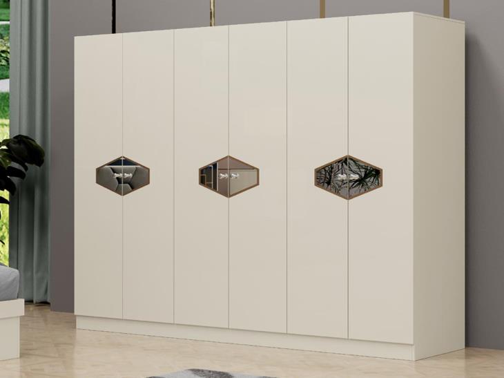 (Double bed with elegant fabric back + 2 side tables with drawers to serve you + Spacious wardrobe designed with 6 doors for high storage space with mirror details that enhance its beauty + Elegant dressing table with multiple drawer units to store your personal items with a mirror to complete your look + Attractive dressing chair with charming backrest + Multiple drawer unit to provide you with additional organizing space + Elegant bench chair with charming backrest to enjoy a comfortable and distinctive sitting experience + Elegant mirror holder to complete your look)