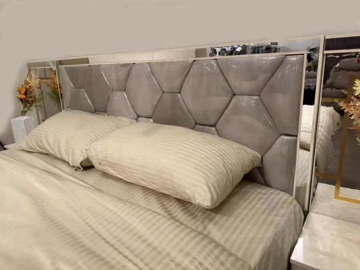 (سرير مزدوج بظهر من القماش الأنيق + 2 طاولة جانبية بأدراج لخدمتك + دولاب ملابس واسع مصمم بـ 6 أبواب لمساحة تخزين عالية بتفاصيل مرآة تزيد من جماله + طاولة تسريحة أنيقة بوحدات أدراج متعددة لتخزين أغراضك الشخصية مع مرآة لإكمال مظهرك + كرسي تسريحة جذاب بمسند ظهر ساحر + وحدة أدراج متعددة لتوفر لك مساحة تنظيم إضافية + كرسي بنش أنيق بمسند ظهر ساحر للاستمتاع بتجربة جلوس مريحة ومميزة + حامل مرآة أنيق لإكمال مظهرك)