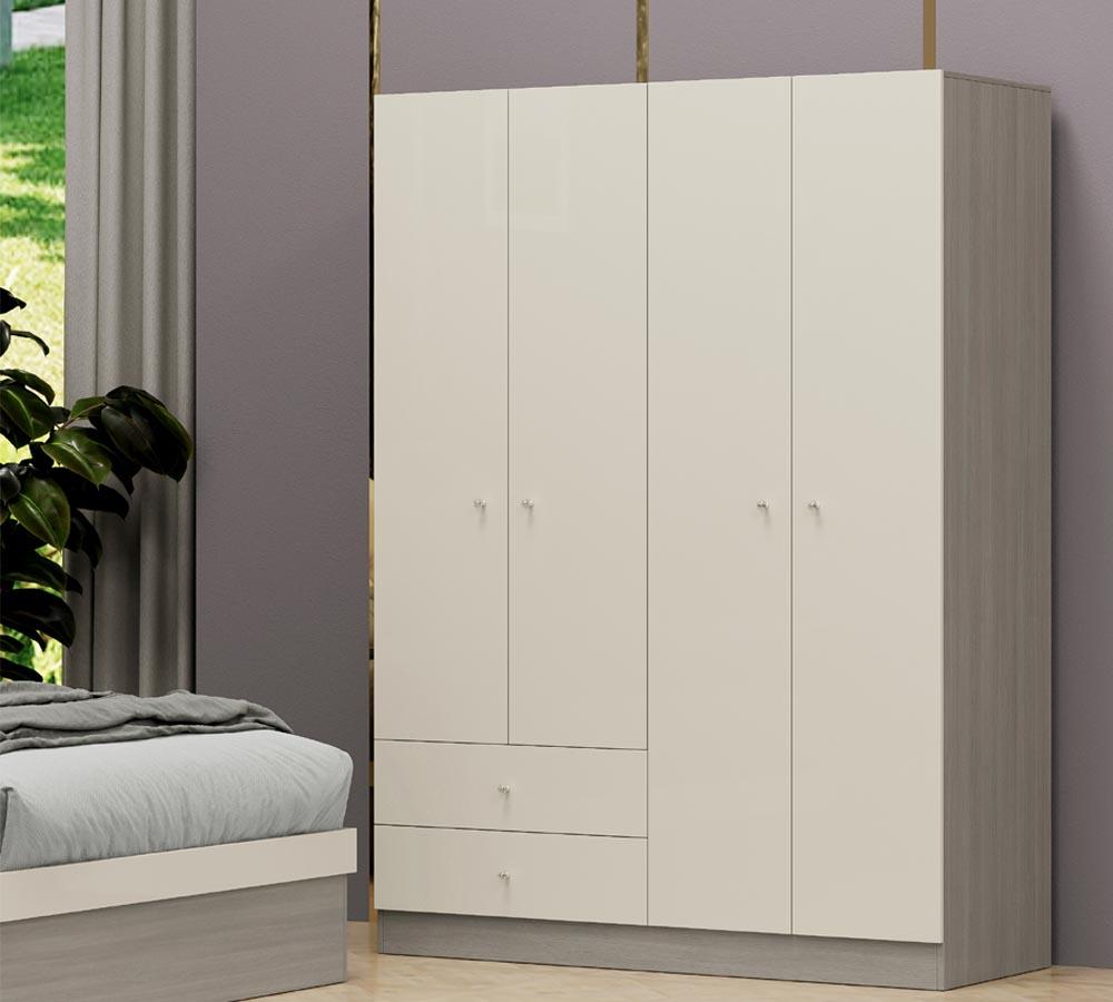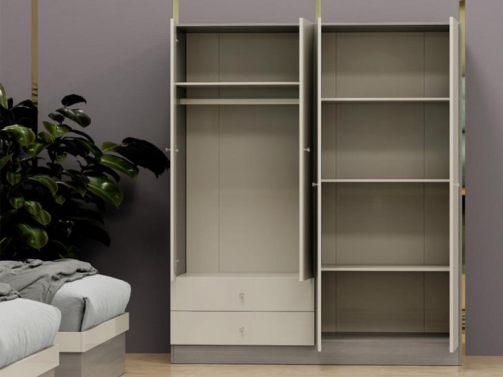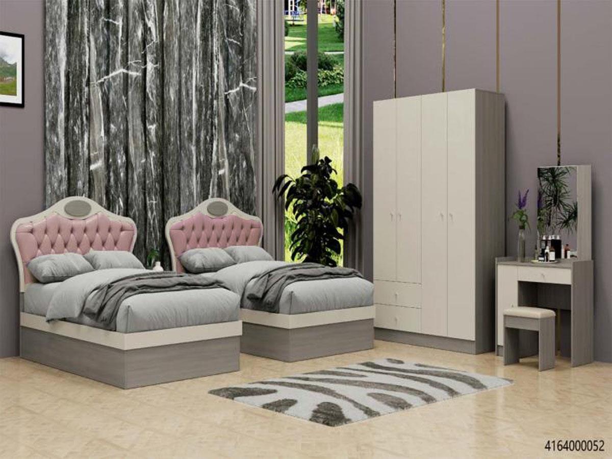 (2 سرير فردي أنيق بظهر جلدي مميز من مادة بي في سي + طاولة خدمة جانبية بأدراج لخدمتك + دولاب ملابس واسع مصمم بـ 4 أبواب لمساحة تخزين عالية + طاولة تسريحة أنيقة بوحدات أدراج متعددة لتخزين أغراضك الشخصية مع مرآة لإكمال مظهرك + كرسي تسريحة جذاب ومسند ظهر رمادي ساحر)