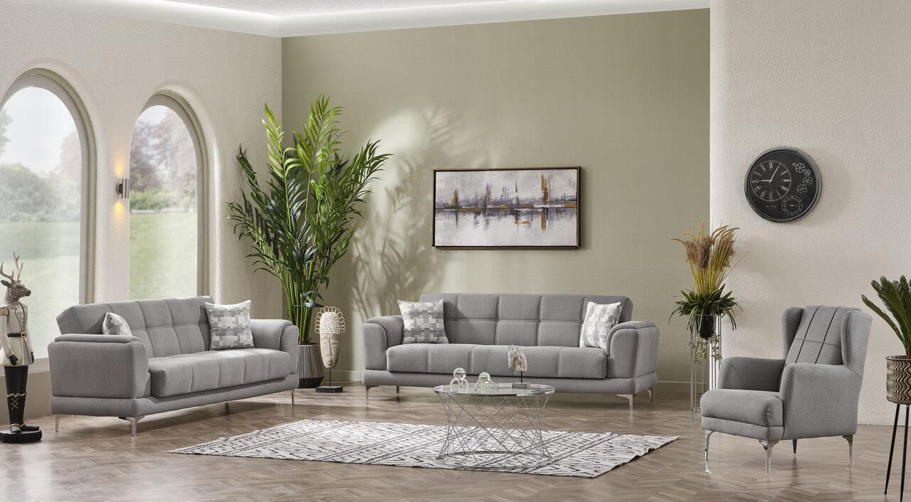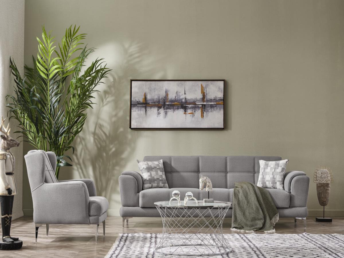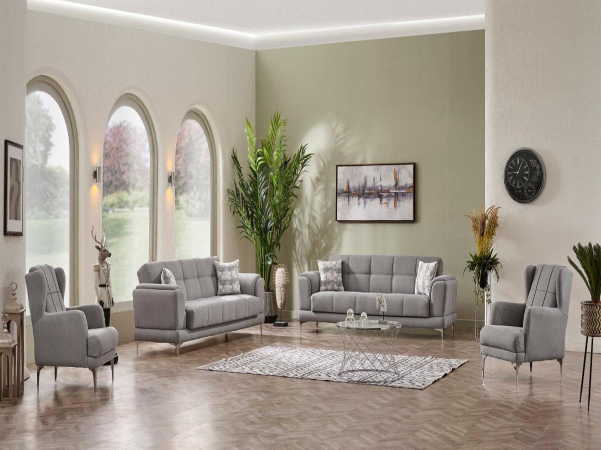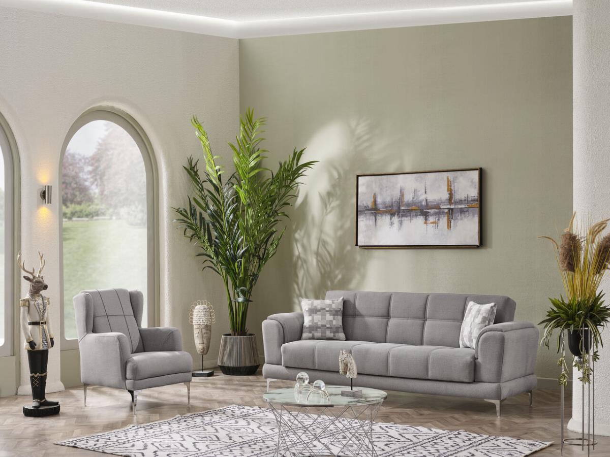 هذه المجموعة مصنوعة من لوح الخشب الصناعي المضغوط و المتين عالي الجودة و بحشو الإسفنج الرغوي بسماكة تصل الى 28 DNC لضمان القوة و التحمل , كما أنها منسوجة بأفضل أنواع القطن الصناعي فائق النعومة لضمان الراحة و المتانة و الاستدامة , تتميز بتصميم عصري جذاب و باللون الرمادي الفاتح الفاتن , تأتي بأرجل من البلاستيك و الكروم المتين لضمان القوة و الثبات و سهولة النقل و التحريك , قطعة عصرية مميزة تناسب منزلك و مساحتك , لتجربة استخدام تدوم طويلاَ .